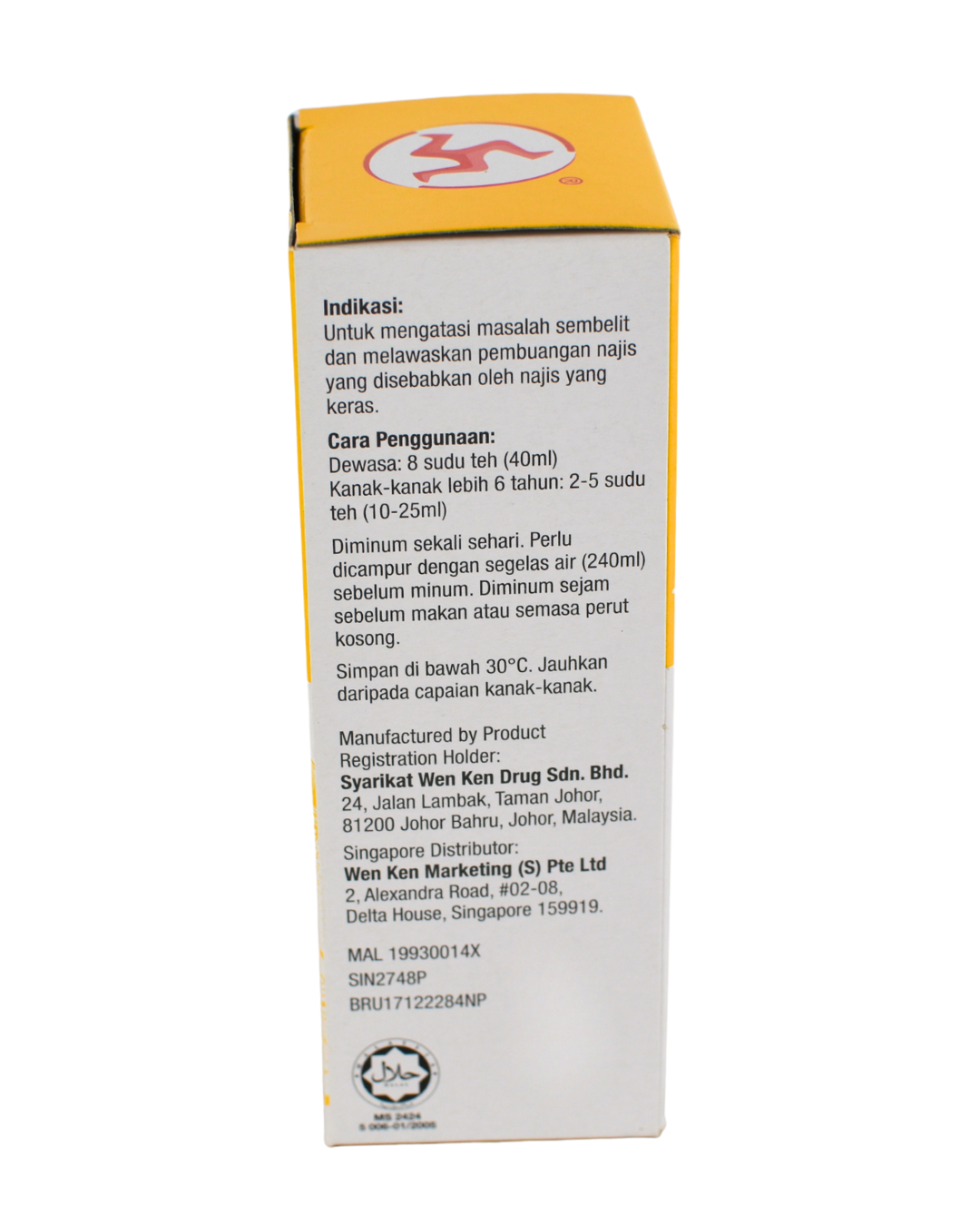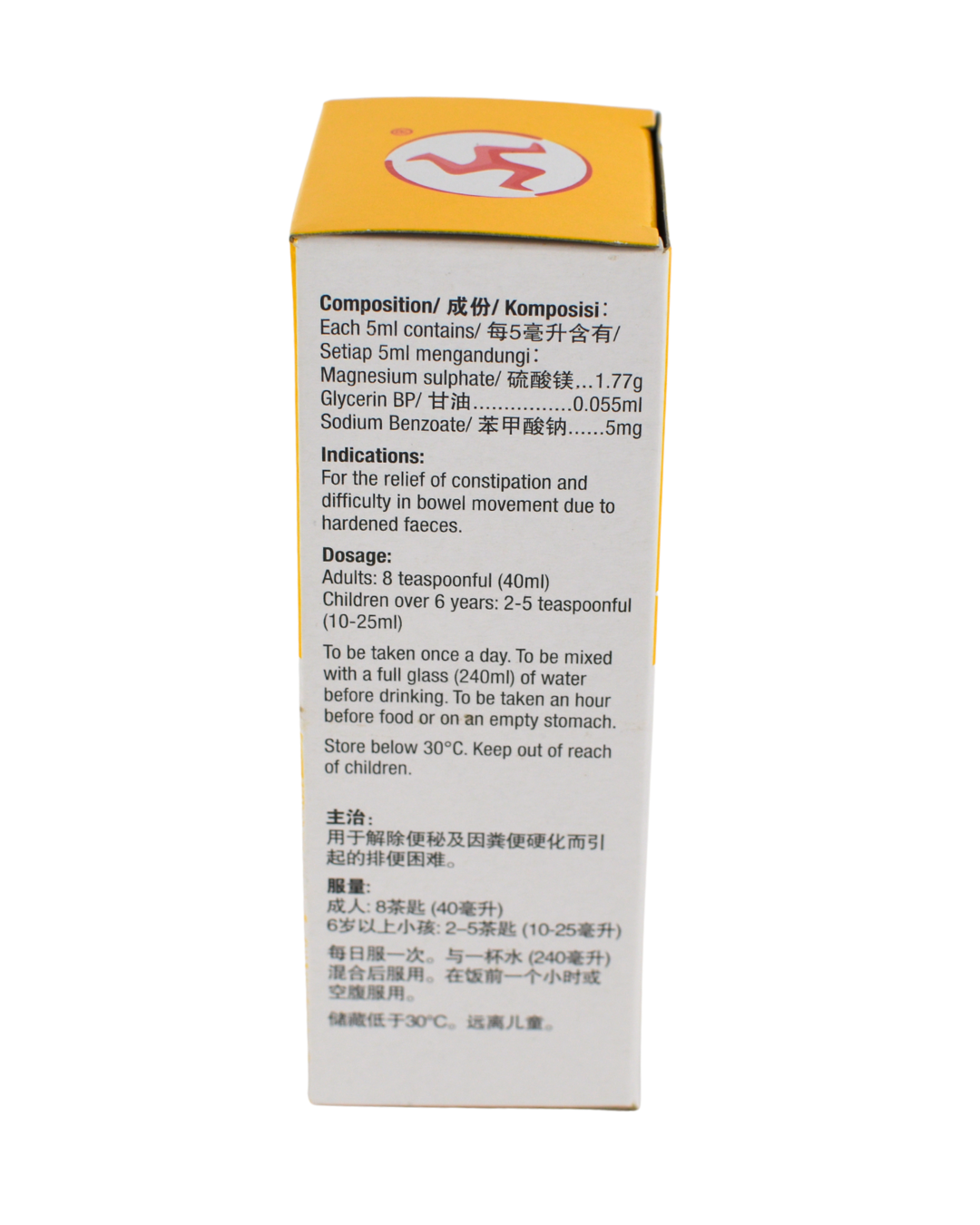 Three Legs Lemon Sweet Purgative is a transparent liquid stored in a PET bottle, featuring a sweet lemon flavor for effortless consumption. It combines Magnesium Sulphate and Glycerin in its formula, effectively softening stools and enhancing bowel movements to alleviate constipation. The PET bottle packaging ensures safety by minimizing the risk of breakage and leakage, providing convenience for home use.
