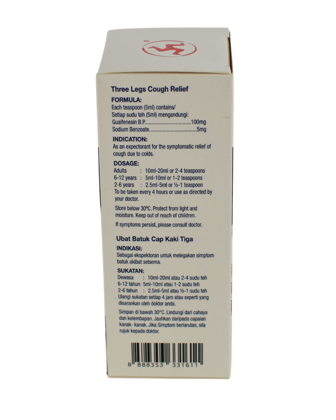 Guaifenesin works by thinning out stubborn phlegm and mucus lodged in the chest and throat, providing effective relief from cough symptoms.Three Legs Cough Relief facilitates the expulsion of phlegm orally, promoting easier breathing and respiratory comfort.