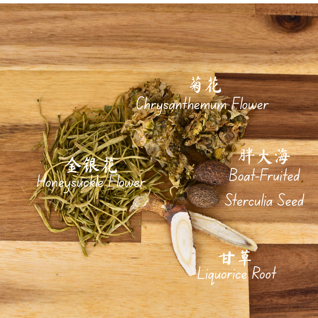 This tea treats respiratory conditions such as sore throat, hoarseness, and loss of voice. The herbs work together to clear heat, soothe the throat, and restore voice function, effectively treating symptoms of colds, flu, and other respiratory infections.
