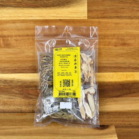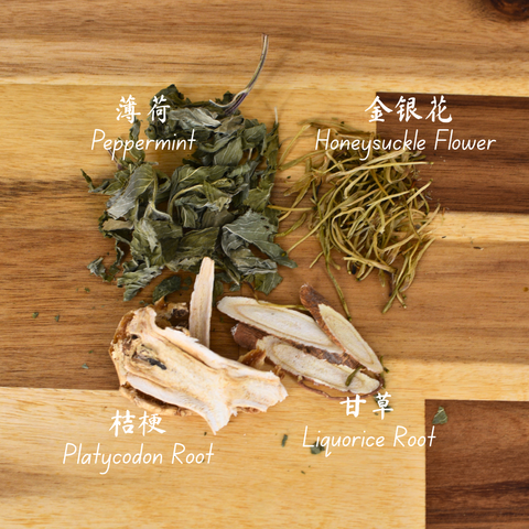 This tea treats respiratory conditions such as sore throat, cough, and loss of voice. The herbs work together to clear heat, expel phlegm, soothe the throat, and relieve symptoms of colds, flu, and other respiratory infections.