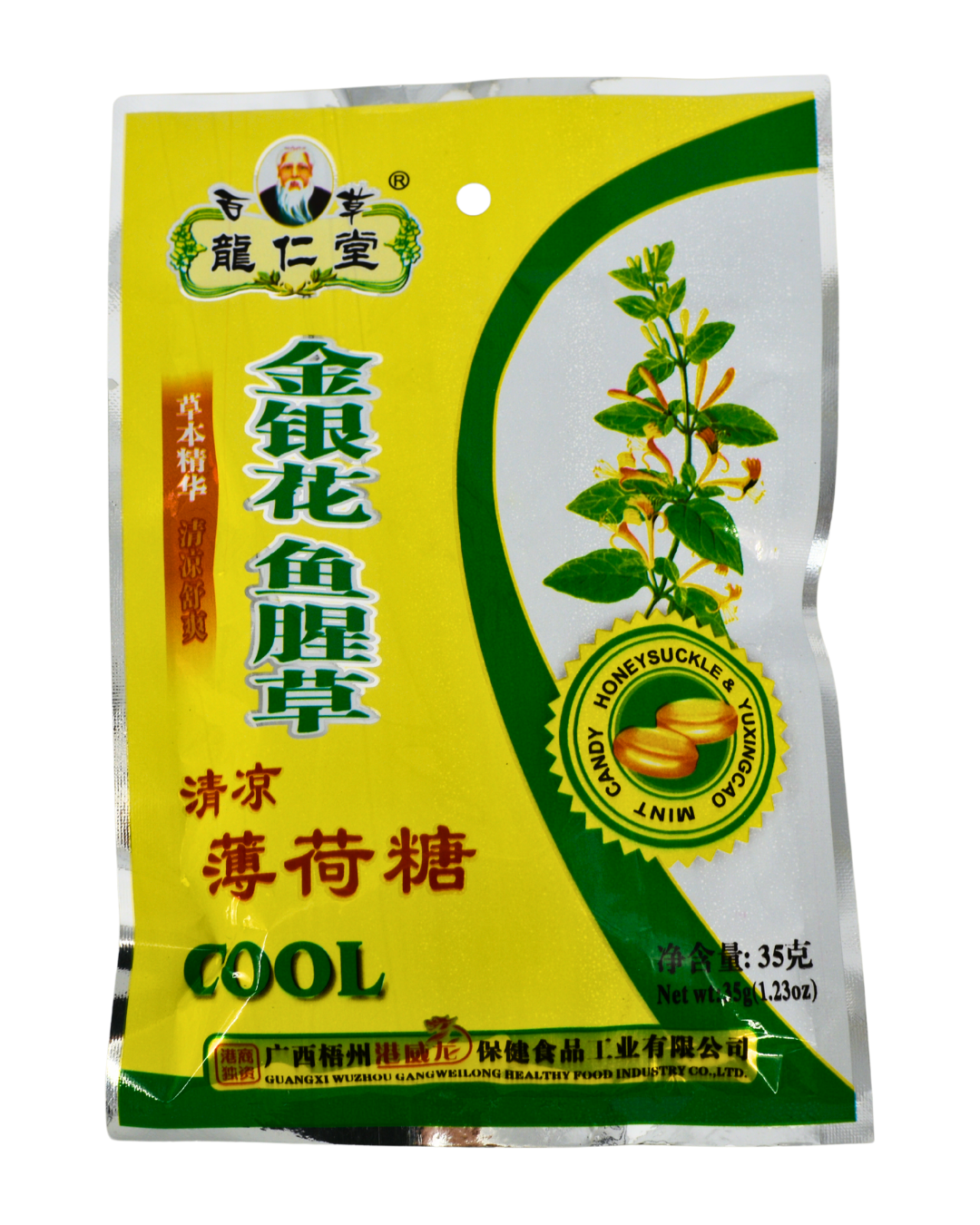Jinyinhua Yuxincao Sweet 金银花鱼腥草糖 Store in a cool dry place Nett weight 35g(1.23oz) Ingredients: Sugar Water Honey-Suckle Yuxingcao Corn Mint Liquourice Best before: See Package